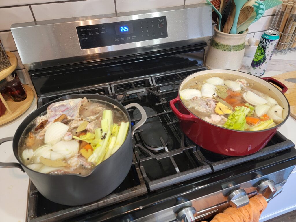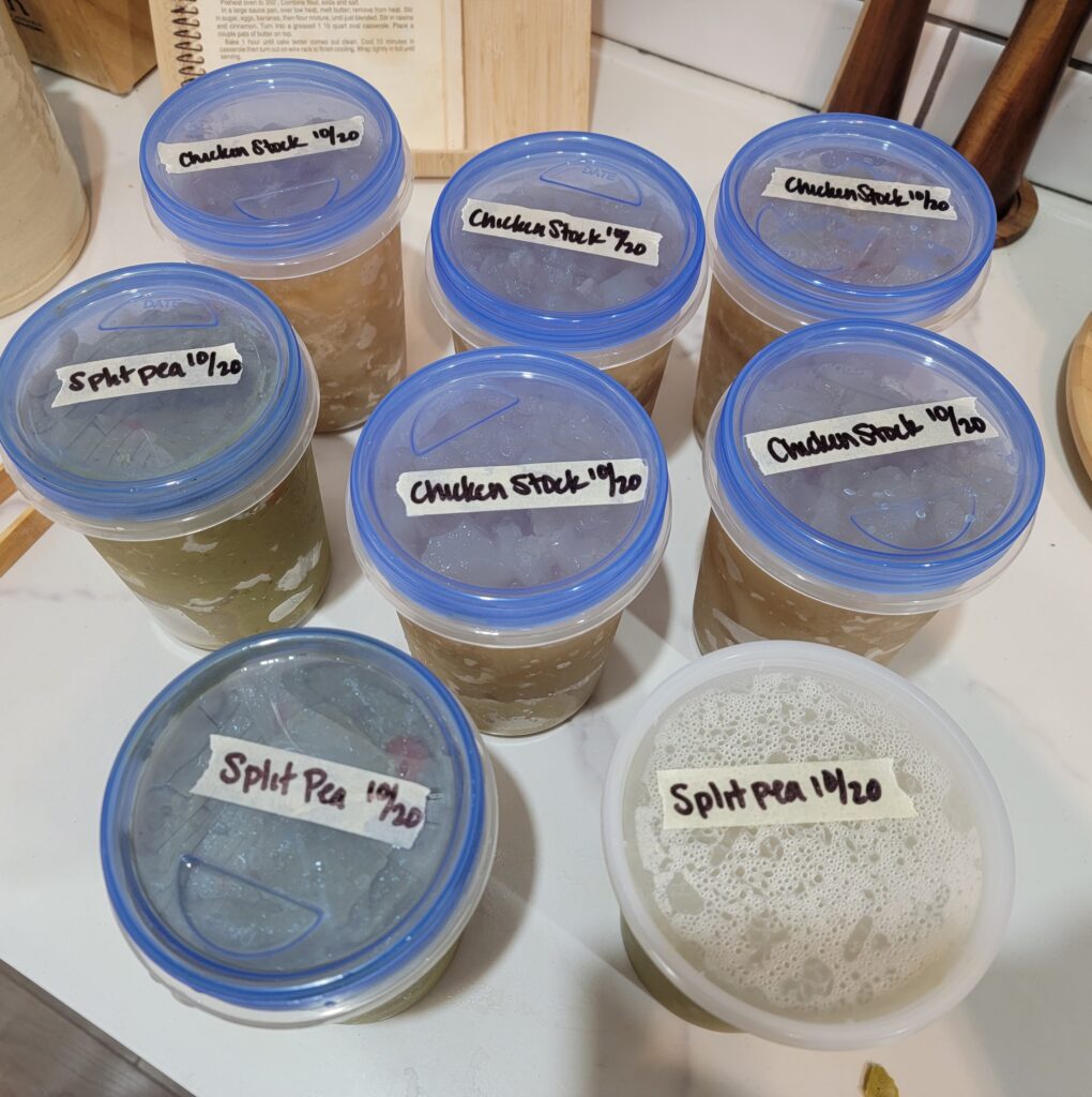 Lastly, it’s soup season!!! I spent time recently making chicken stock (my friend and coworker saves her Costco rotisserie chicken carcasses for me, so once I have 4 saved up I make a batch of stock) that I keep in my freezer to use as needed. For the first photo above I had 8 carcasses, so I made 2 batches. I usually get anywhere from 3-4 quarts of stock per batch. With this batch I also used some to make a bit of split pea soup, so you can see those in the second photo. These are the leftovers that I also froze so that we have soup for busier winter evenings. I just love a good soup, especially one that cooks for a few hours in the cold winter afternoons.