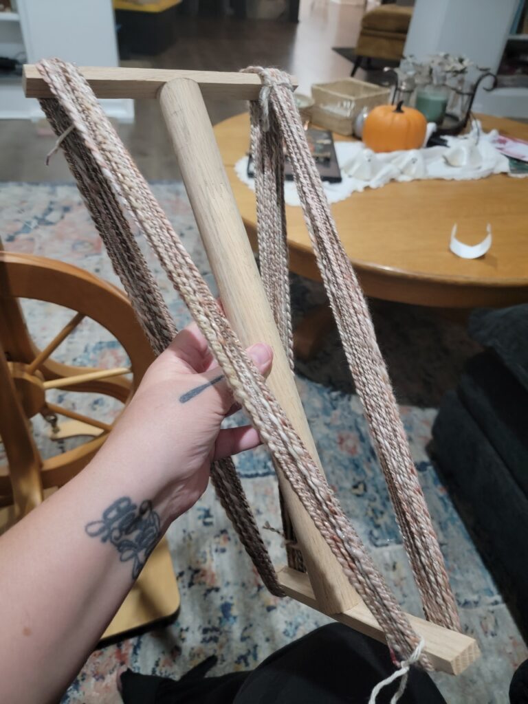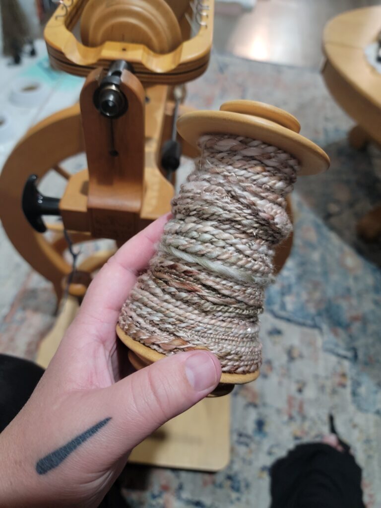 Back when I was first given this spinning wheel I was also given some really lovely natural fiber to spin, but I quickly wanted to switch to some I had on hand, as I would like for the beautiful, natural fiber (rambouillet) to be something I use when I have the hang of things. I think it would be really nice to be able to make a “forever” thing from it, so want my skill level to be something that can create a more consistent yarn. After I had learned to use a drop spindle I bought some fiber and I had most of the braid left, so I put an empty bobbin on the wheel and started to spin. I spun up enough to fill about half of the bobbin, and I was noticing that my plies were becoming more consistent and I was really happy with it. I took that bobbin off and didn’t think much about using that unplied fiber because, well, it wasn’t great, so I started a spin with another braid that I finished and posted about earlier. But as I thought about it, I wanted to spin a second bobbin of the first fiber so that I could ply it with the first one and have my first attempt, even if it wasn’t going to be knit in anything. So. above you can see the result. One ply was my first ever try, then the second was after I had been practicing for a while. I’ve since soaked, thwacked and hung it to dry.