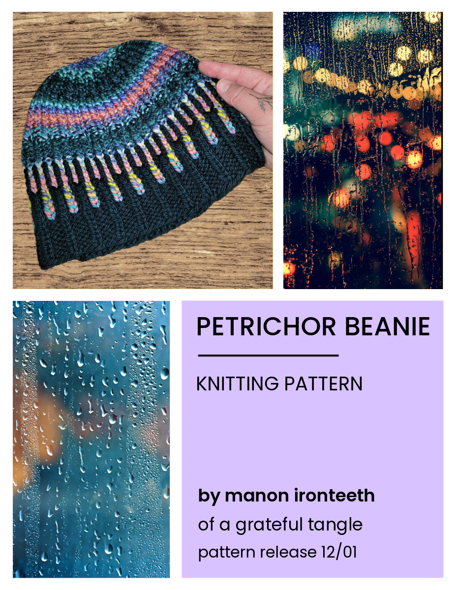 I came up with the idea after a rainstorm rolled through our city this past summer. Living in the desert we don’t get much rain, especially in the warm months, and the rain was pouring down in a way that made the lights through our windows look magical. The word “petrichor” means the pleasant smell of the rain after a dry period, so I thought it fit perfectly. It’s a quick knit that only took me a few hours. I’m very proud of how it worked out.